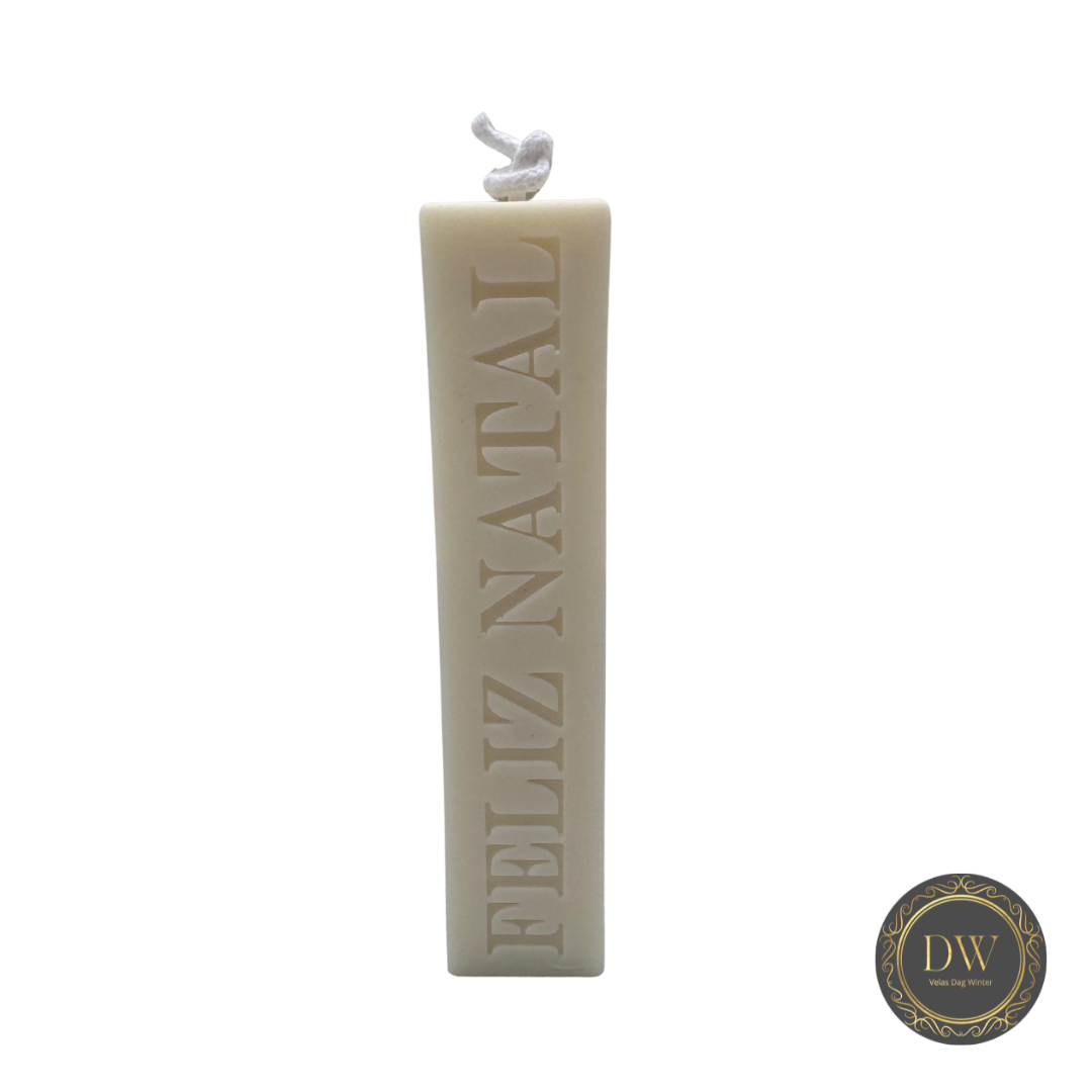 Vela com 3 (três) tipos de palavras sendo;em um lado a palavra feliz natal; no outro lado a palavra ho ho ho e no último lado a palavra abençoado.