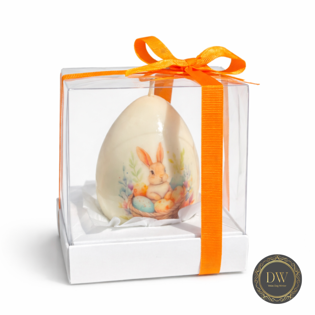 Vela em formato de ovo de páscoa com efeito de porcelana,acompanha caixa de acetato e fita de cetim.